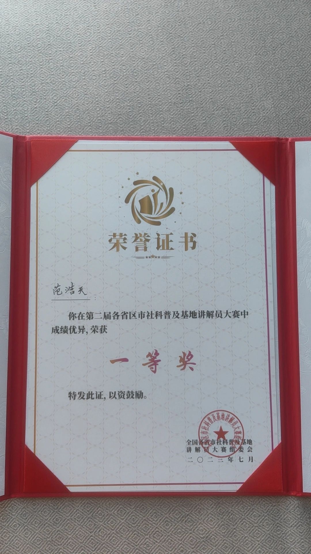 7月26日,第二届各省区市社科普及基地讲解员大赛决赛如期举行。来自全国各地的28支代表队81名选手展开了激烈角逐,我馆讲解员范浩天最终凭借优异的表现荣获大赛一等奖。