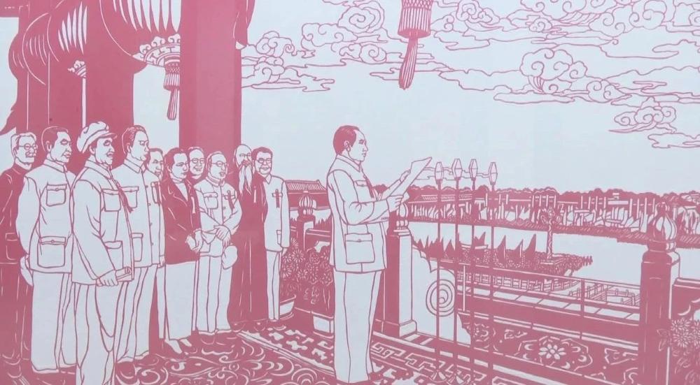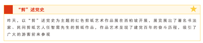 “剪”述党史——红色剪纸艺术作品展,展出了任智需先生的18幅剪纸作品,《红船》——1921年,中共一大在上海召开,会议最后一天转移到浙江嘉兴南湖的红船上,中国共产党正式成立;《开国大典》——1949年10月1日下午3时,毛泽东在北京天安门城楼上宣告中华人民共和国,中央人民政府成立了……一张张栩栩如生的剪纸背后,是一个个激动人心的历史瞬间,出神入化的非遗剪纸艺术与红色文化碰撞,让人眼前一亮,久久难忘。