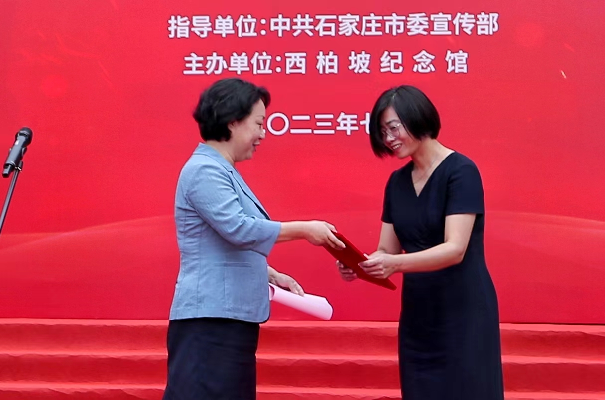开展仪式现场,正定县红色文化艺术学会副会长乔美素代表学会和任智需会长向我馆捐赠红色主题巨幅剪纸作品102幅,西柏坡纪念馆馆长卢润彩向正定县红色文化艺术学会颁发捐赠证书。